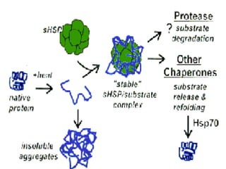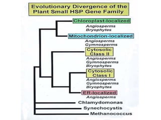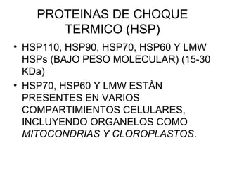 Las proteínas de choque térmico (HSP) son proteínas conservadas que se expresan en respuesta al estrés térmico y ayudan a prevenir daños en las proteínas. Varias clases de HSP como HSP110, HSP90, HSP70 y HSP60 se encuentran en diversos compartimientos celulares como las mitocondrias y los cloroplastos. La transcripción génica de las HSP es el punto de control clave en su expresión en respuesta al estrés térmico.