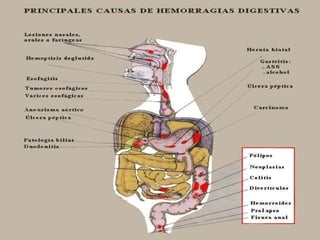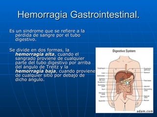 Este documento describe la hemorragia gastrointestinal, dividida en alta y baja. La hemorragia alta se origina desde la boca hasta la segunda porción del duodeno, mientras que la hemorragia baja se origina desde la tercera porción del duodeno hasta el ano. Se detallan las causas, signos y síntomas, clasificación, diagnóstico y tratamiento de ambos tipos de hemorragia gastrointestinal.