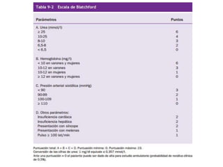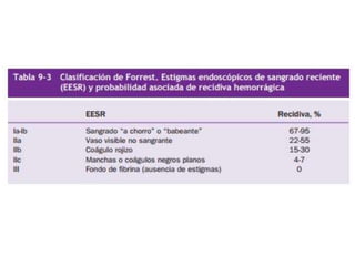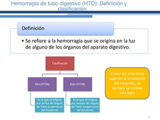 Este documento clasifica y describe el sangrado de tubo digestivo alto. Define hemorragia de tubo digestivo y la clasifica como alta (por encima del ángulo de Treitz) o baja (por debajo del ángulo de Treitz). También clasifica el sangrado alto según su evolución, volumen y manifestación, e identifica las posibles etiologías esofágicas, gástrico-duodenales y el diagnóstico diferencial.