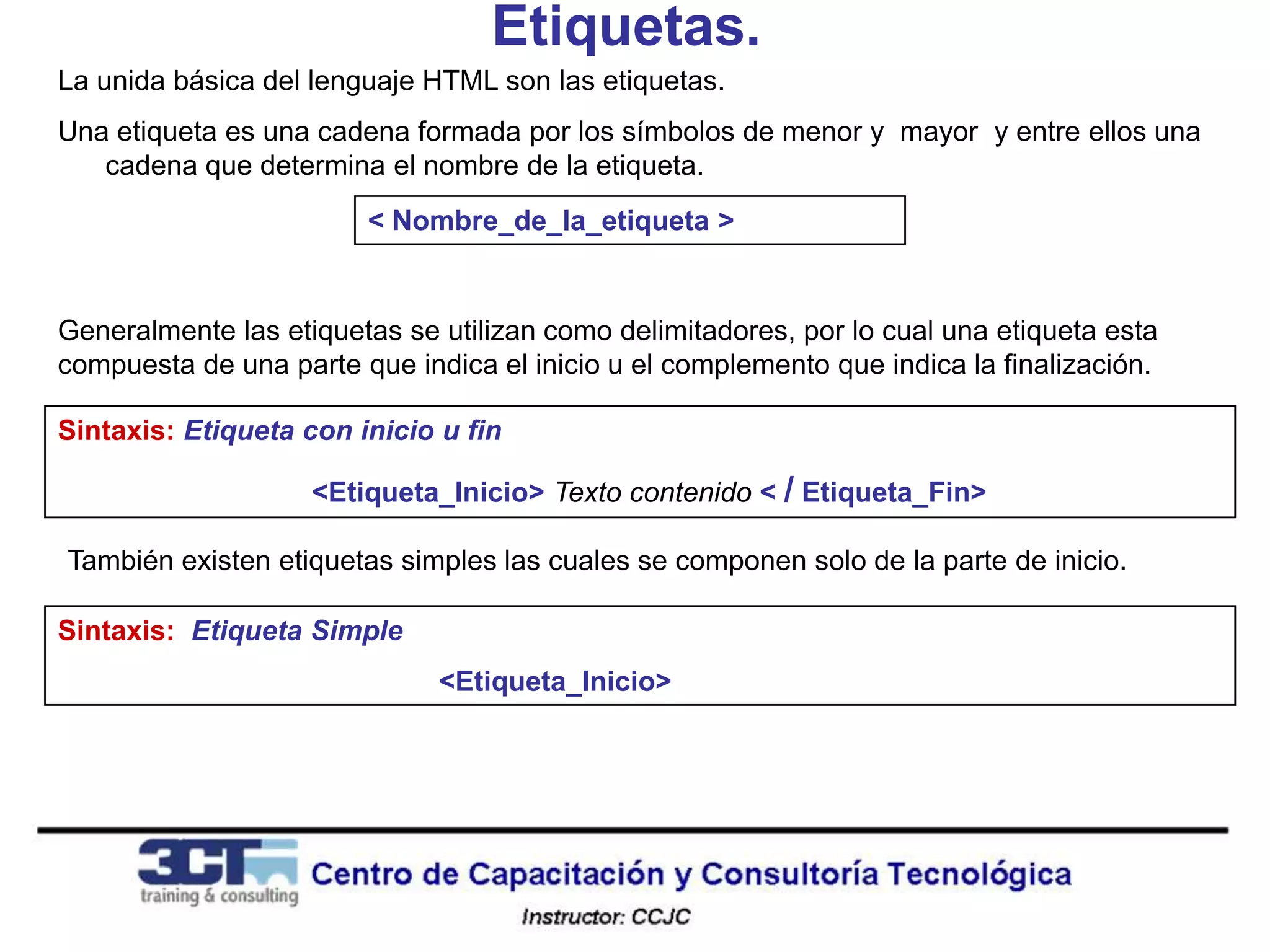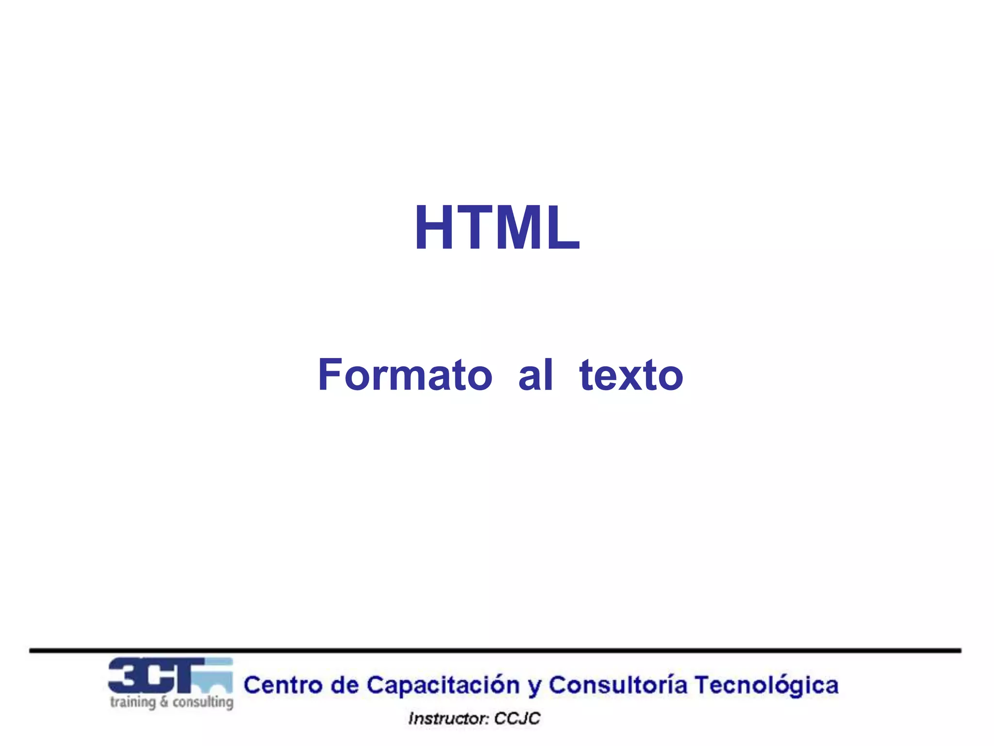 El documento describe las etiquetas básicas de HTML para formato de texto como párrafos, encabezados, fuentes, colores y estilos. Explica cómo las etiquetas como <p>, <h1-6>, <font>, <br>, <hr>, <b>, <i> y <u> se usan para estructurar y dar formato a un documento HTML.