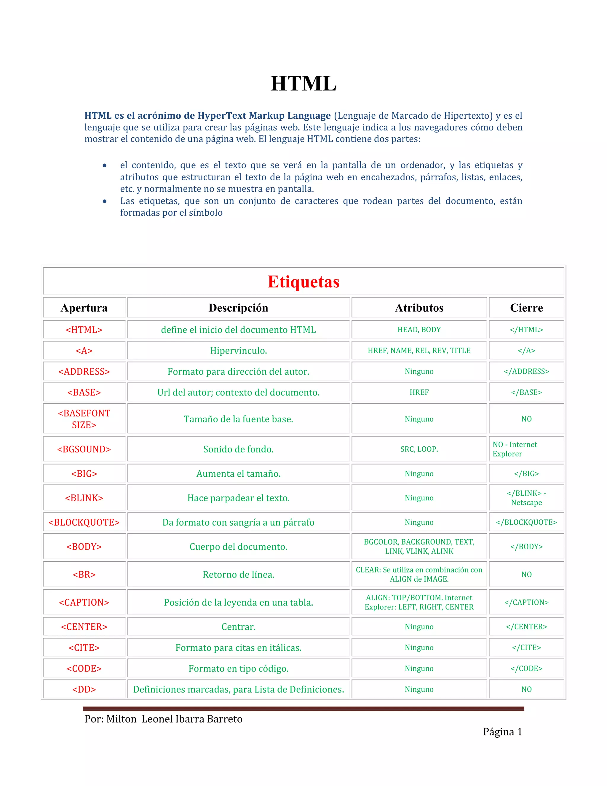 HTML es el lenguaje usado para crear páginas web. Consiste en etiquetas que indican al navegador cómo mostrar el contenido y estructurarlo en encabezados, párrafos, listas e hipervínculos. Las etiquetas tienen atributos que especifican propiedades como el tamaño de fuente o la dirección de una imagen.