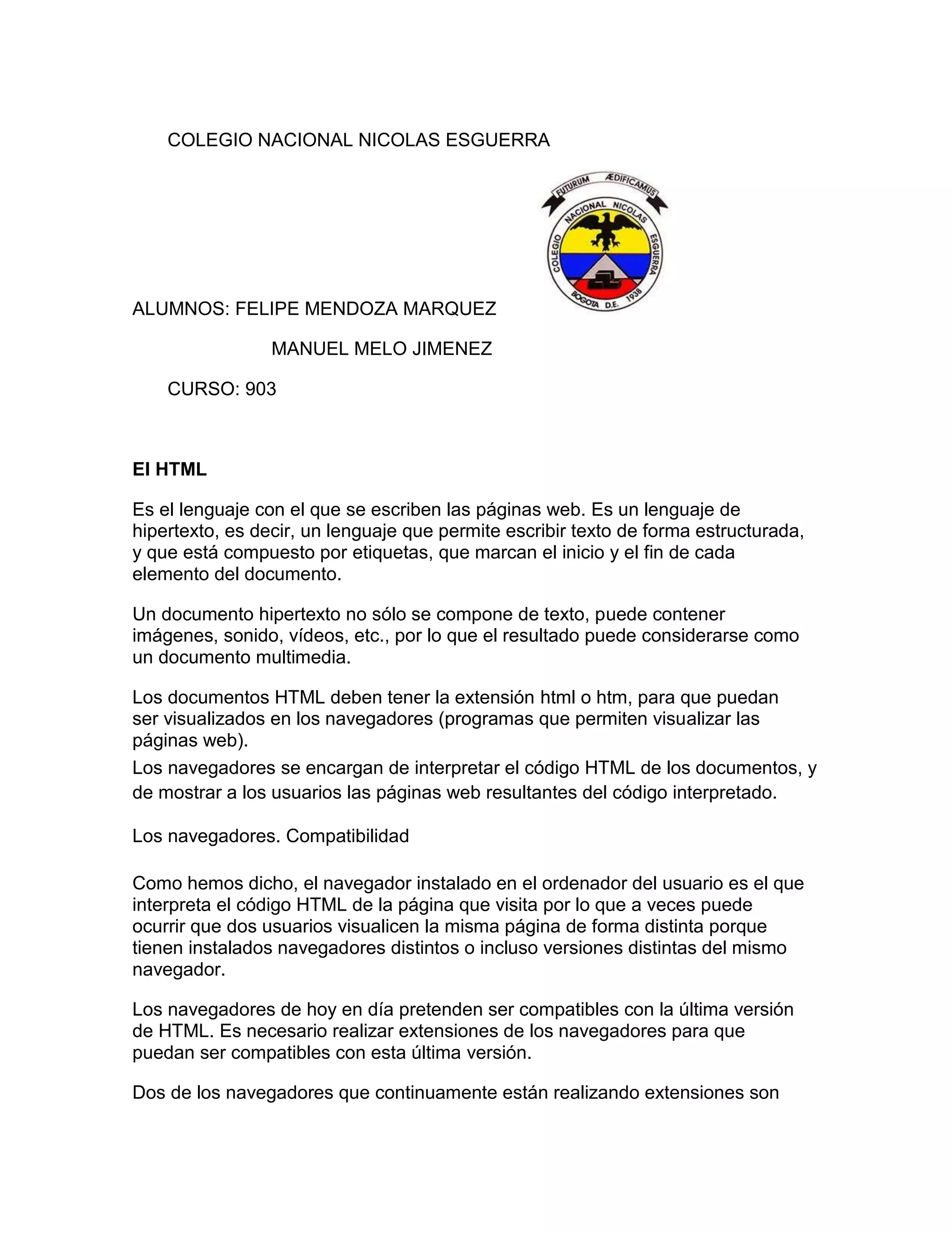 El documento describe el lenguaje HTML que se usa para crear páginas web. Explica que HTML usa etiquetas para estructurar el texto y otros elementos como imágenes y videos. También describe los navegadores que interpretan el código HTML y muestran las páginas web, así como editores que permiten crear páginas web sin escribir código HTML directamente.