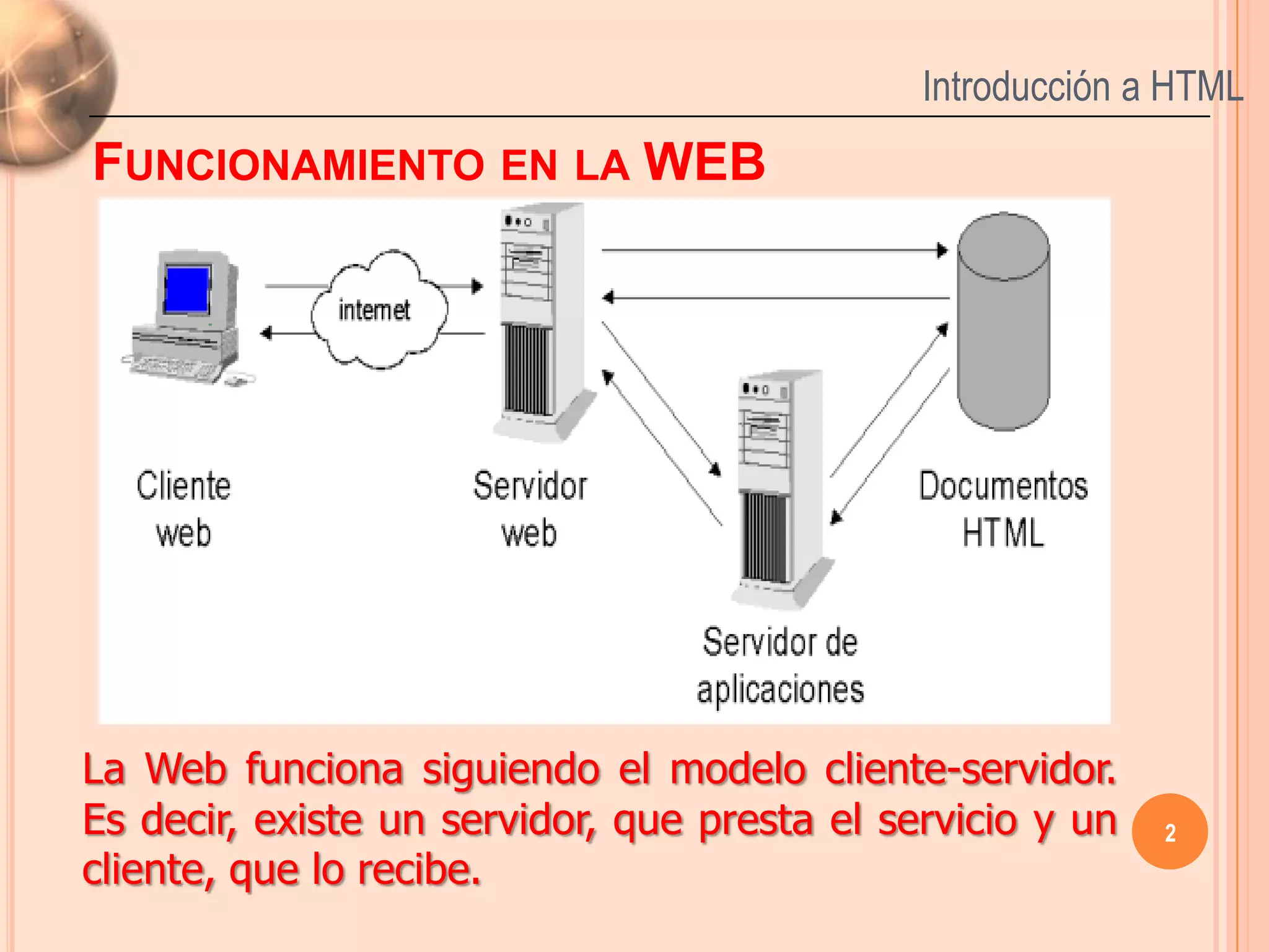 El documento introduce los conceptos básicos de HTML y el funcionamiento de la web. Explica que la web sigue un modelo cliente-servidor, con un servidor que ofrece el servicio y clientes que lo reciben. Además, describe que HTML es un lenguaje de marcado usado para estructurar y presentar contenido en la web, y que consiste en etiquetas que definen el significado y formato del texto.