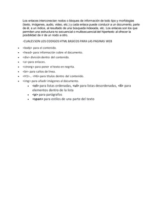 HTML es el código que se utiliza para estructurar y desplegar páginas web y sus contenidos como párrafos, listas e imágenes. Requiere un editor de texto para acceder al código fuente y modificar la página. Los editores de texto permiten crear y editar archivos de texto sin formato utilizados comúnmente para código, scripts y programación. Los códigos HTML básicos incluyen etiquetas para el cuerpo, encabezado, divisiones, enlaces, énfasis, saltos de línea, títulos, imá