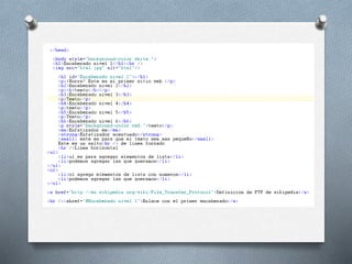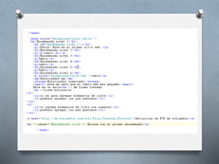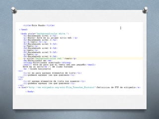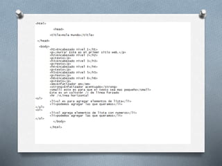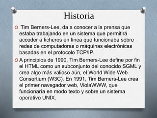 El documento describe la historia y desarrollo del lenguaje de marcado HTML desde su creación por Tim Berners-Lee en 1989 hasta la actualidad. Explica elementos básicos como etiquetas, atributos y códigos HTML para estructurar el contenido de una página web. También incluye ejemplos de cómo agregar formato, enlaces e imágenes a una página HTML.