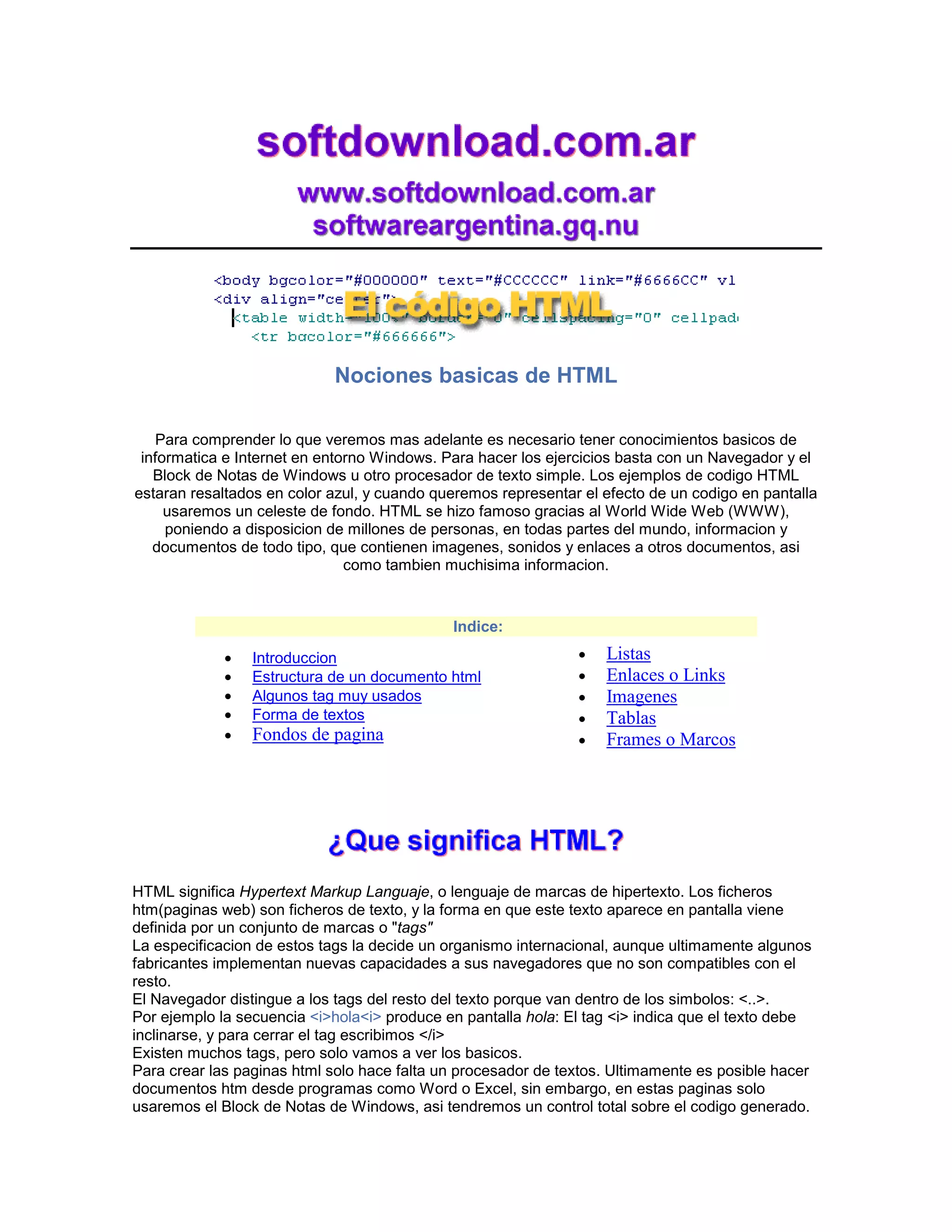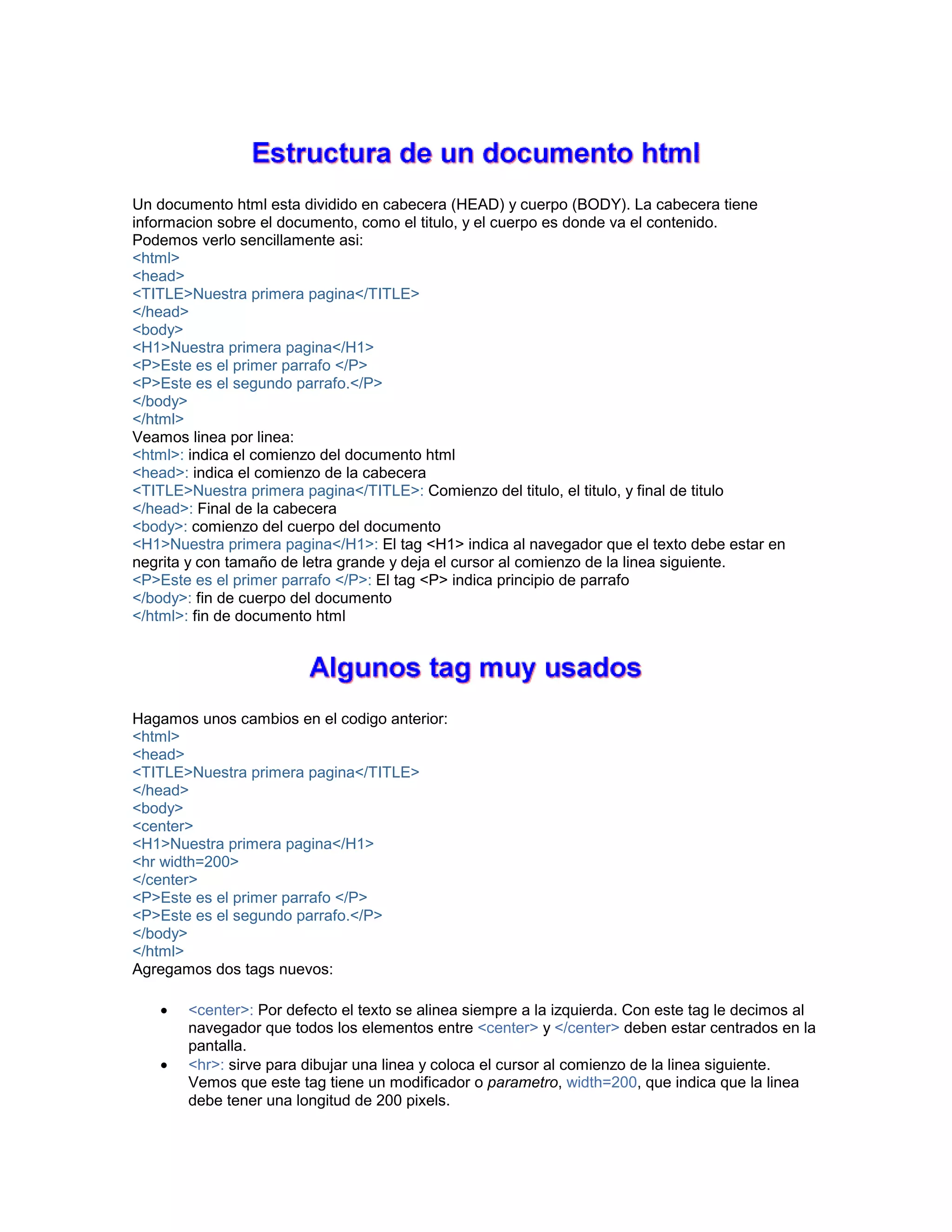 El documento proporciona una introducción a los conceptos básicos de HTML. Explica que HTML se utiliza para crear páginas web y contiene marcas que definen la estructura y el formato del contenido. Luego resume los principales elementos de HTML como encabezados, párrafos, listas, enlaces e imágenes y cómo se pueden usar para dar formato al texto y estructurar la información.