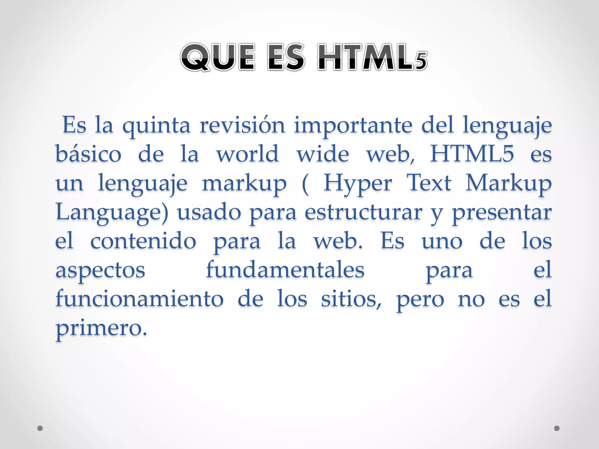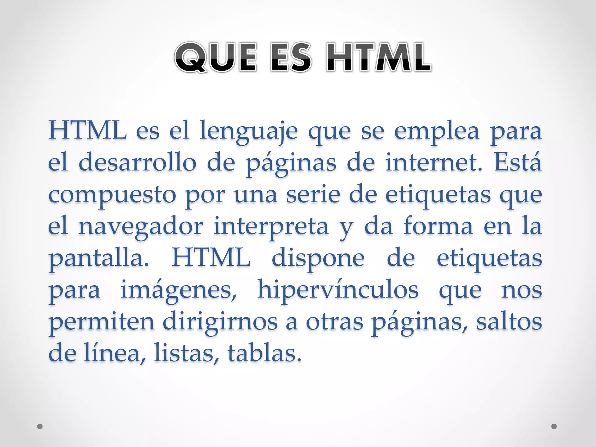 HTML es el lenguaje utilizado para desarrollar páginas web y está compuesto de etiquetas que dan formato al contenido en la pantalla, incluyendo etiquetas para imágenes, hipervínculos, saltos de línea y tablas. HTML5 es la quinta revisión del lenguaje básico de la World Wide Web y se utiliza para estructurar y presentar contenido web de manera fundamental. Las etiquetas delimitan los elementos de un documento HTML y pueden contener atributos opcionales especificados entre comillas.