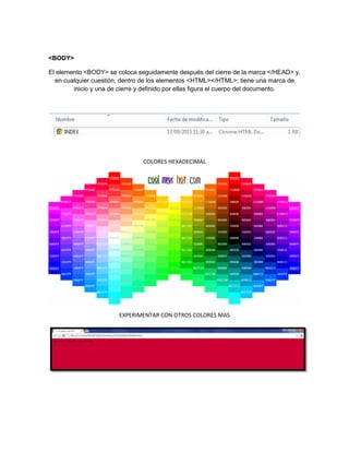 Este documento proporciona una introducción básica a las etiquetas HTML más comunes utilizadas para estructurar un documento web, incluyendo <HTML>, <HEAD> y <BODY>. Explica que <HTML> define el comienzo y fin del documento completo, <HEAD> contiene información para el navegador y motores de búsqueda, y <BODY> define el contenido visible de la página.