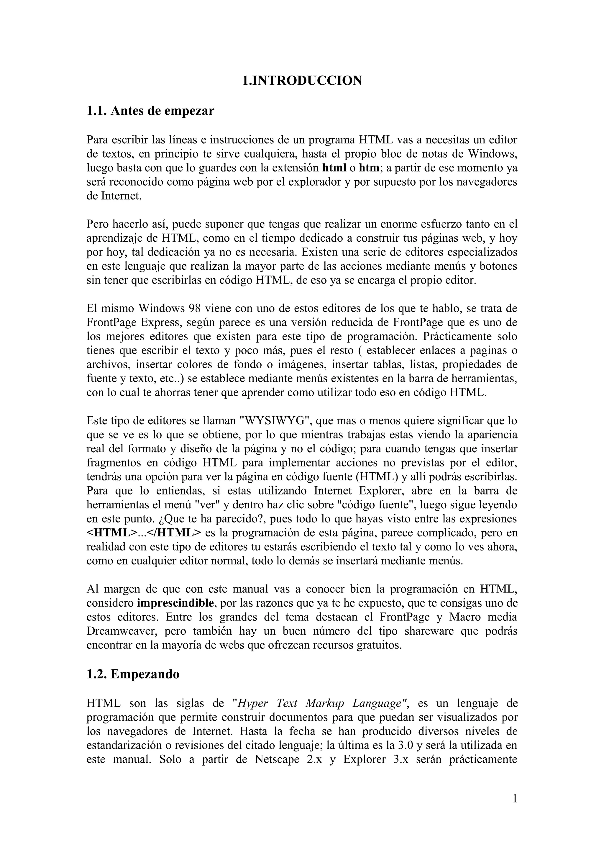 Este documento introduce HTML y editores web. Explica que HTML permite crear documentos para ser visualizados en navegadores y que existen editores WYSIWYG que facilitan la creación de páginas web sin necesidad de aprender código. También describe cómo crear una página web de ejemplo con seis archivos y estructurarla con las etiquetas HEAD, TITLE, META y BODY.