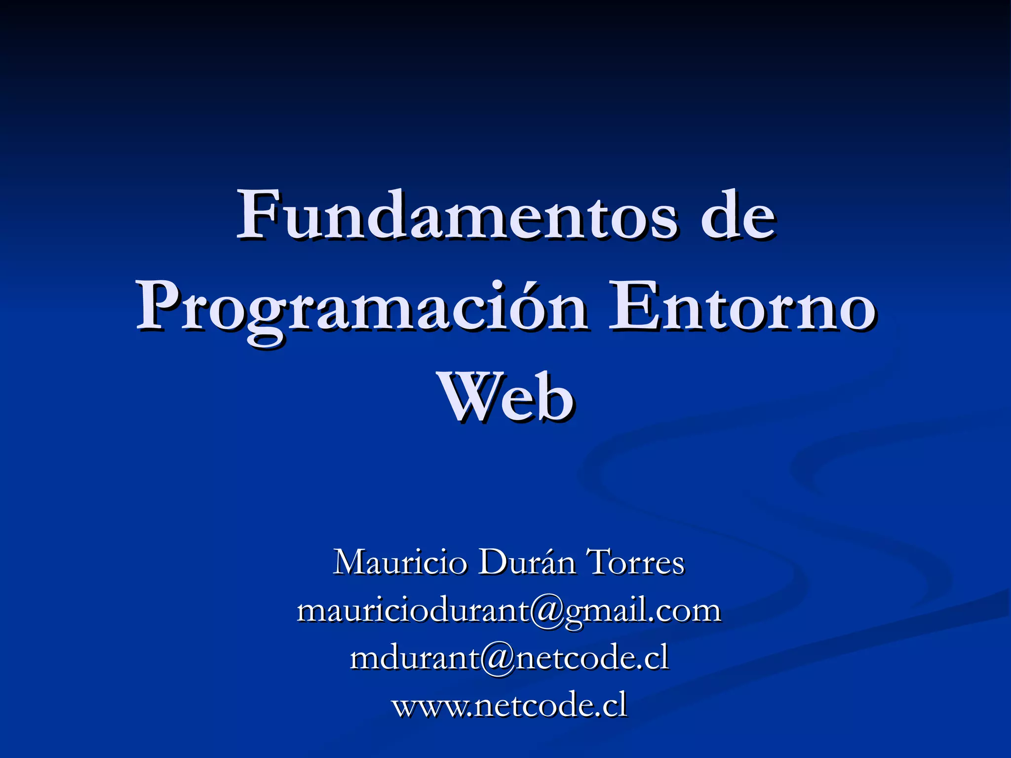 El documento habla sobre fundamentos de programación para el desarrollo de páginas web. Explica que Internet es una red descentralizada de redes interconectadas que usan protocolos TCP/IP. También describe servicios web como SOAP y XML, y define una página web como un conjunto de instrucciones en HTML para visualizar contenido. Además, resume las características y etiquetas básicas de HTML como <body>, <a> y <p> que se usan para estructurar el contenido de una página.
