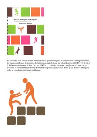 El documento detalla información sobre cursos de formación de formadores en modalidad teleformación en las Islas Canarias, incluyendo requisitos y acreditaciones necesarias. Se destaca la importancia de la capacitación para docentes y ofrece un panorama sobre títulos y certificaciones relacionados con la formación profesional. Además, menciona oportunidades de prácticas y becas para los participantes, resaltando el enfoque pedagógico del curso.