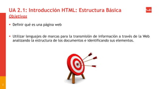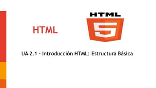 Este documento introduce los conceptos básicos de HTML, incluyendo: (1) la definición de una página web como un documento de texto con marcas, (2) la estructura básica de un documento HTML con la cabecera y el cuerpo, y (3) las etiquetas y atributos comunes como <html>, <head>, <title>, <body>, <p>, entre otros. Explica cómo estos elementos se combinan para crear la estructura y contenido de una página web.