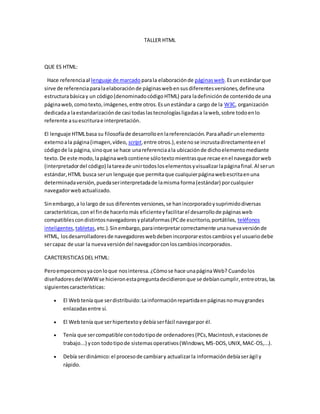 HTML es el lenguaje estándar para crear páginas web. Define la estructura básica y el código para el contenido de una página como texto e imágenes. Se basa en la referenciación donde los elementos externos como imágenes se enlazan en lugar de incluirse directamente. Solo se necesita un editor de texto simple para crear páginas web en HTML.