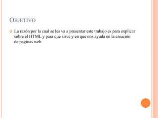 Este documento explica qué es HTML y cómo se usa para crear páginas web. HTML es un lenguaje de marcado que usa etiquetas angulares para estructurar el contenido de una página web. Incluye códigos básicos como <head>, <title>, <body>, <h1-h6> y <table>, así como atributos que mejoran las etiquetas.