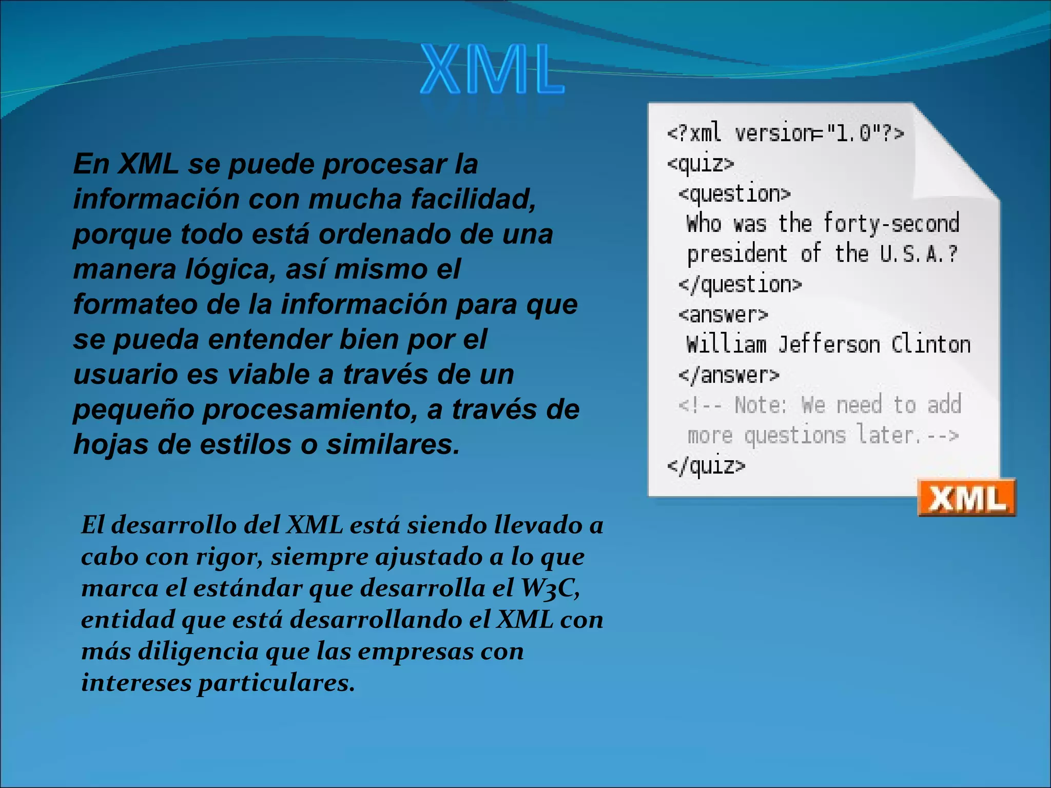 El documento describe las diferencias entre XML, HTML y XHTML. Explica que XML se enfoca en estructurar la información de manera lógica y ordenada, mientras que HTML se utiliza para dar formato a la información y presentarla en los navegadores. También indica que XML no reemplaza a HTML, sino que lo complementa al permitir manejar la información de forma separada al formato.