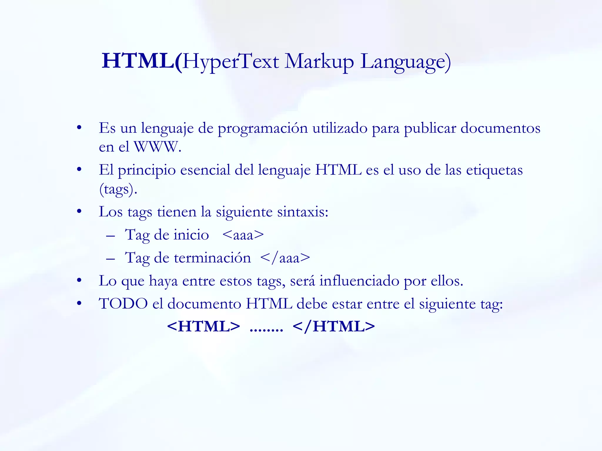 HTML es un lenguaje de marcado utilizado para publicar documentos en la Web. Los documentos HTML contienen etiquetas que definen su estructura y formato. La etiqueta <HTML> envuelve al documento completo. La sección <HEAD> contiene metadatos como el título. La sección <BODY> contiene el contenido visible como texto, imágenes y listas. Las etiquetas como <P> y <BR> controlan el formato del texto, mientras que etiquetas como <IMG> incrustan imágenes. Los hipervínculos <A> permit