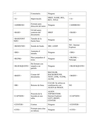 El documento define HTML como el lenguaje de etiquetas que define las páginas web, originalmente creado para publicar texto e imágenes pero que ahora se usa para contenido multimedia. Explica que HTML ha evolucionado a través de varias versiones para adaptarse a nuevos usos. A continuación, lista muchas etiquetas HTML comunes y brinda una breve descripción de cada una.