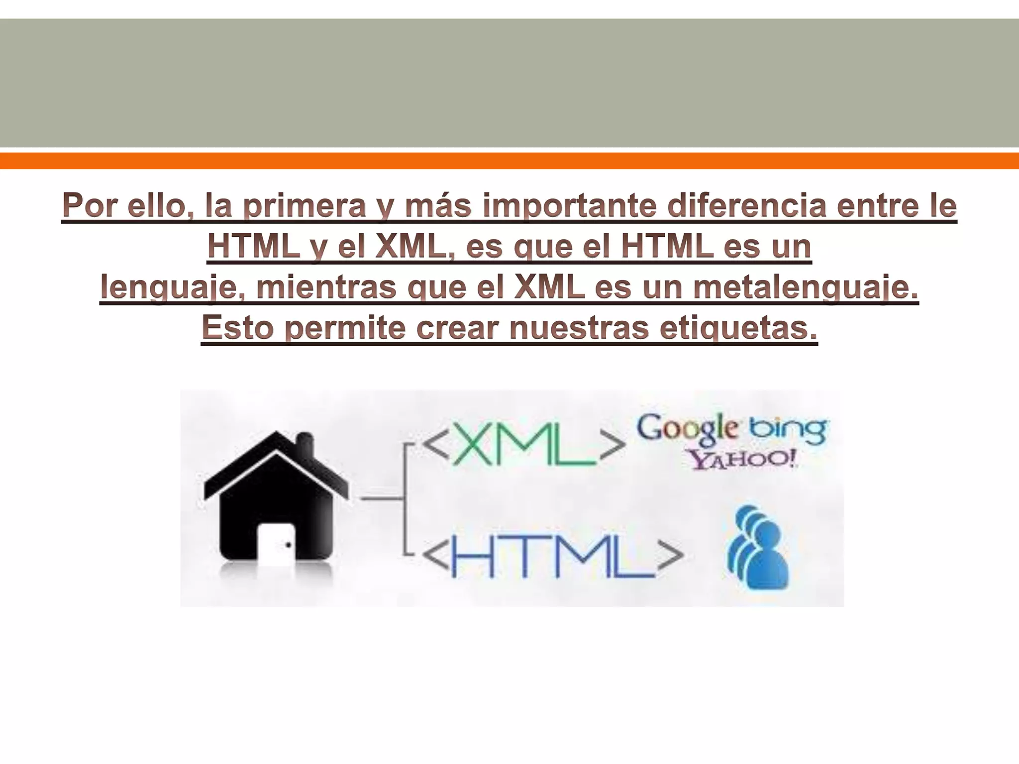 HTML utiliza etiquetas para estructurar páginas web y mostrar contenido en los navegadores de forma consistente. XML es un lenguaje similar pero más flexible que permite definir etiquetas personalizadas, con la ventaja de separar el contenido de la presentación y facilitar la integración de datos. Aunque XML aún no se usa tanto como HTML, mejorará la búsqueda en la web al proporcionar metadatos sobre los documentos.