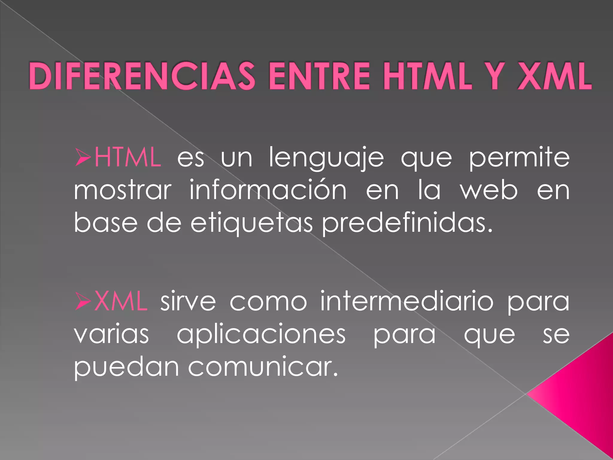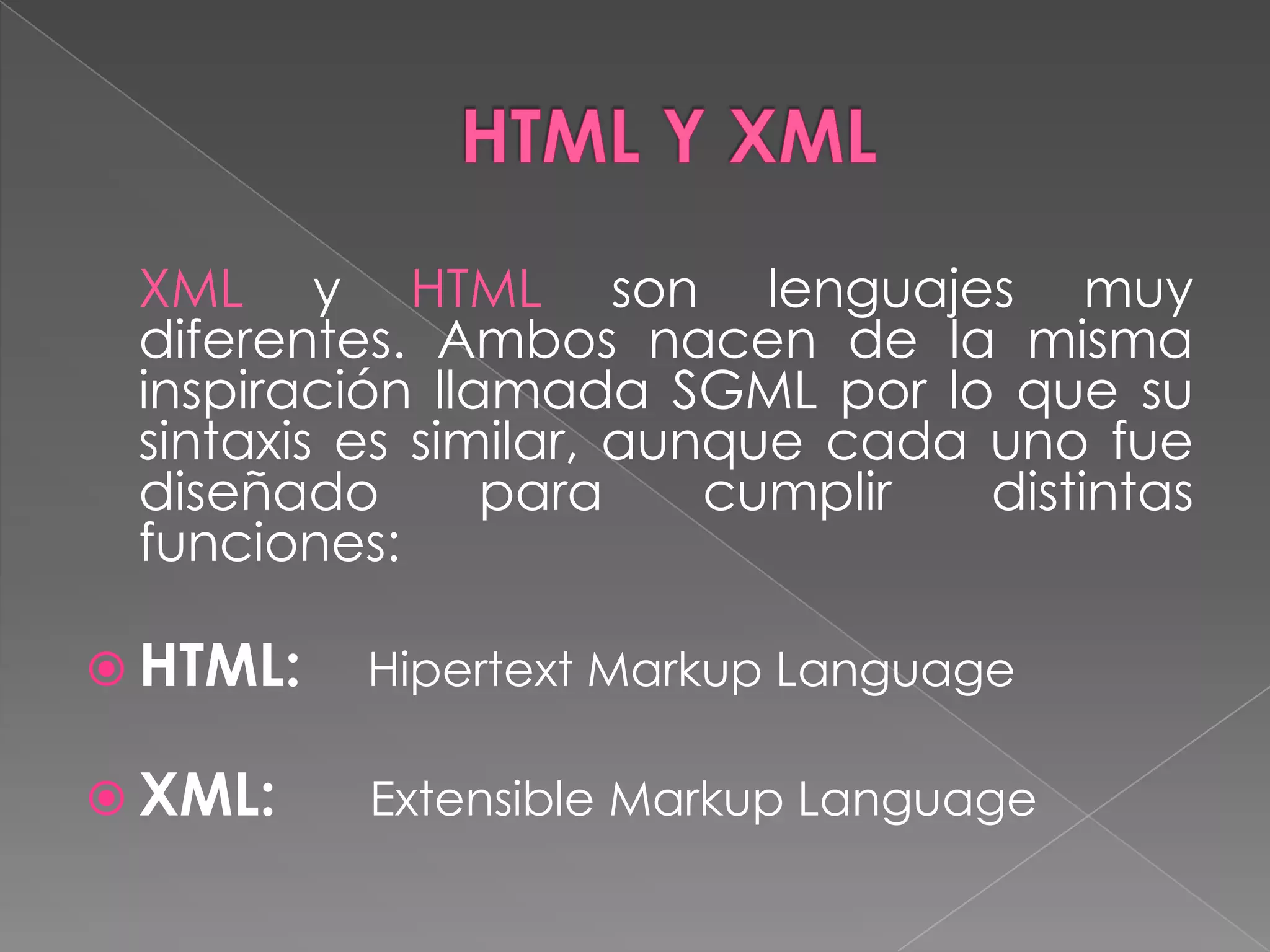 XML y HTML son lenguajes diferentes diseñados para cumplir distintas funciones. HTML sirve para dar formato a la información en la web usando etiquetas predefinidas, mientras que XML permite crear etiquetas personalizadas para estructurar y transportar datos entre aplicaciones de manera independiente del formato. Aunque diferentes, XML y HTML pueden trabajar juntos para presentar y manejar información.