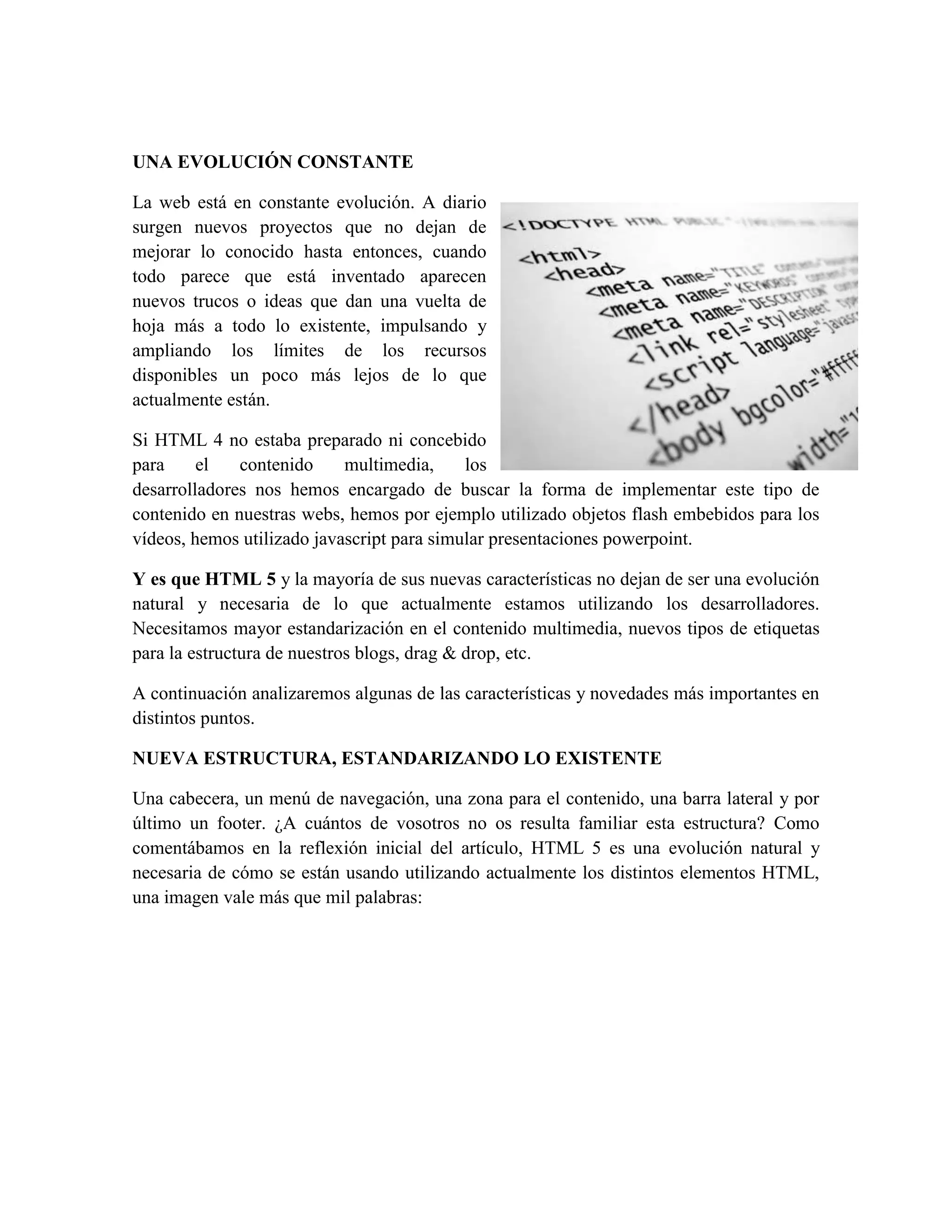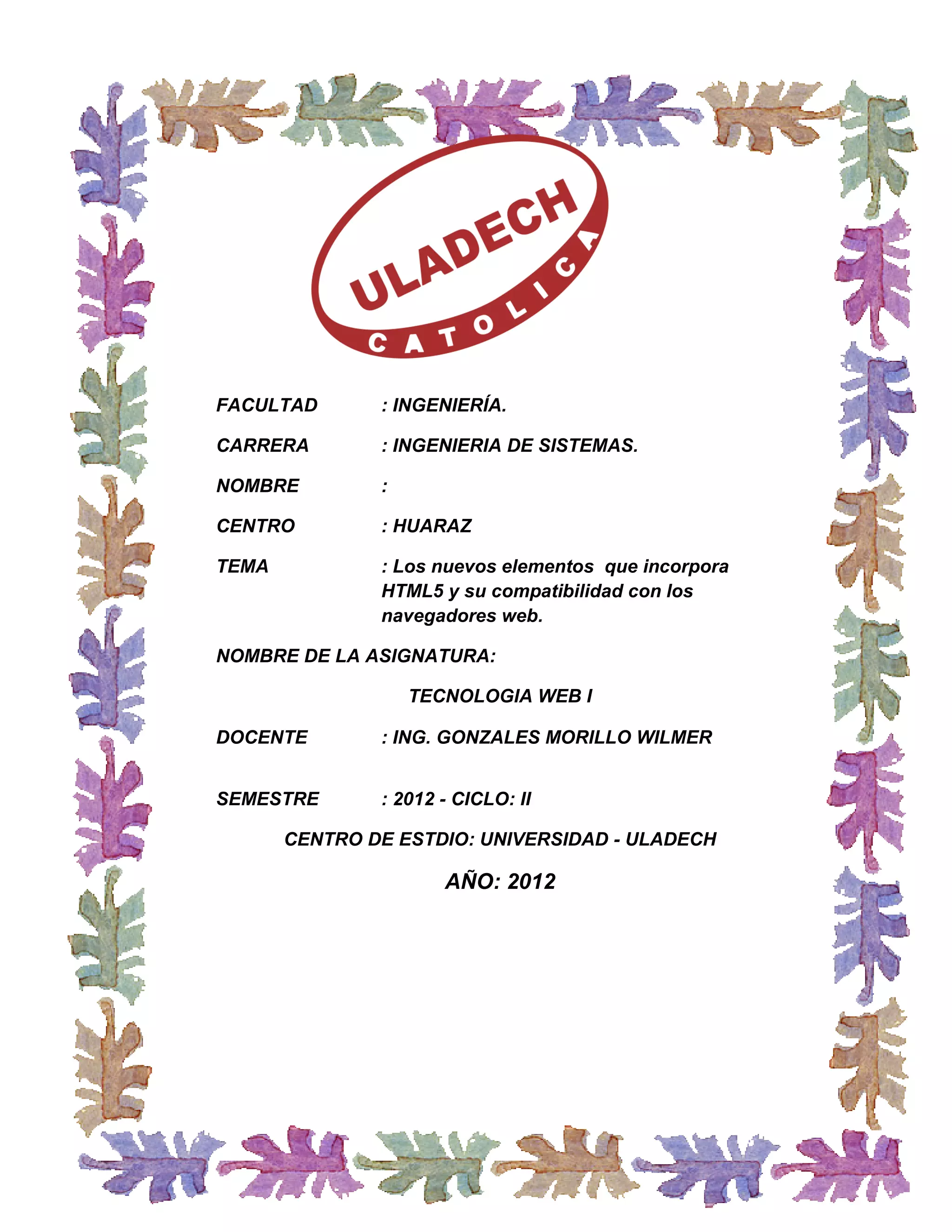Este documento resume los nuevos elementos que introduce HTML5 y su compatibilidad con los navegadores web. Explica que HTML5 es una evolución necesaria que estandariza elementos existentes como cabeceras, artículos y menús de navegación, e introduce nuevos controles para formularios como fechas y búsquedas. También incluye una tabla de compatibilidad de las características de HTML5 y CSS3 en los principales navegadores.