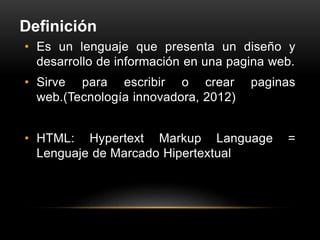 Este documento describe HTML5, un lenguaje de marcado que permite el diseño y desarrollo de páginas web. HTML5 ofrece nuevas etiquetas y códigos que facilitan la inserción de gráficos, animaciones y video. El elemento <canvas> permite dibujar gráficos 2D de forma dinámica a través de scripts.