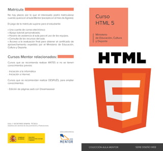 El curso de HTML5 ofrecido por el Aula Mentor permite la matrícula en cualquier momento, exceptuando agosto, y ofrece recursos como correo electrónico y apoyo tutorial. Está diseñado para principiantes sin conocimientos previos y se centra en el diseño web a través de un enfoque en HTML5 y CSS3, complementado con actividades obligatorias y optativas. La formación es online, destacando la autodisciplina como un aspecto clave para el éxito del alumno.