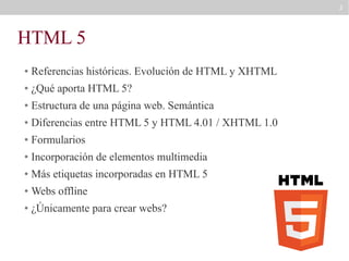 El documento describe las etiquetas semánticas introducidas en HTML5 para estructurar el contenido de una página web de una manera más clara y significativa. Las nuevas etiquetas incluyen <header>, <main>, <nav>, <section>, <article>, <aside> y <footer>, las cuales pueden usarse para dividir la página en diferentes secciones como encabezados, navegación, contenido principal, artículos y más. El documento también incluye ejemplos de cómo estas etiquetas pueden combinarse para definir la estructura general de una pá