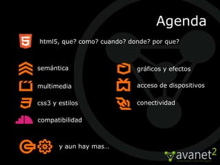 Este documento presenta una introducción a HTML5, incluyendo sus nuevas características semánticas, gráficos, multimedia, acceso a dispositivos, CSS3, conectividad y compatibilidad. Se discuten elementos como <header>, <nav>, <article>, <section>, <aside>, <footer>, Canvas, video, audio, geolocalización, orientación del dispositivo y WebSockets. El documento también cubre herramientas como Modernizr y polyfills para mejorar la compatibilidad.