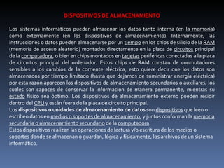 La memoria se refiere a los componentes de una computadora que retienen datos de forma temporal o permanente. Existen diferentes tipos de memoria como la RAM que almacena datos de forma temporal cuando hay energía, y dispositivos de almacenamiento como discos duros y unidades extraíbles que permiten un almacenamiento más permanente. Estos dispositivos incluyen discos magnéticos, ópticos y extraíbles como USBs.