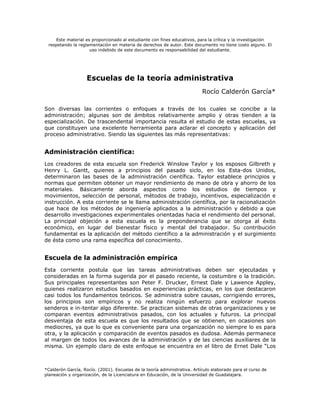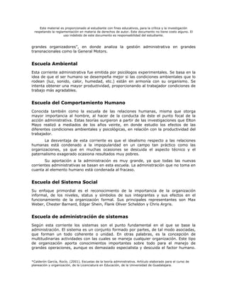 Este documento resume las principales escuelas de la teoría administrativa, incluyendo la administración científica, la escuela de la administración empírica, la escuela ambiental, la escuela del comportamiento humano, la escuela del sistema social, la escuela de administración de sistemas, la escuela de la teoría de las decisiones, la escuela de la medición cuantitativa, el neo humano relacionismo y la escuela universal o del proceso administrativo. Cada escuela se describe brevemente con sus principales representantes y contribuciones.