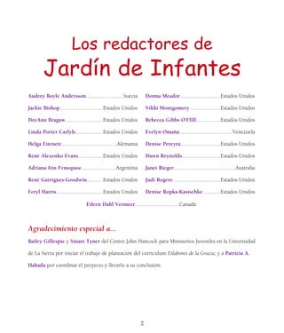 Este documento es una guía de estudio bíblica para niños de 3 a 5 años de edad. Contiene 13 lecciones que cubren historias y enseñanzas de Jesús, con versículos bíblicos, ilustraciones y actividades. Cada lección se centra en una virtud como el servicio, la adoración o la comunidad y cómo practicarla siguiendo el ejemplo de Jesús.