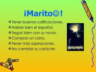 Este documento presenta los deseos y aspiraciones para el próximo año de varias personas, incluyendo Marito, Nahomi, Katia, Estrella, Estefany y Lili. Cada persona desea mejorar académicamente, fortalecer relaciones personales y alcanzar metas personales como viajar, encontrar el amor y ayudar a los demás.