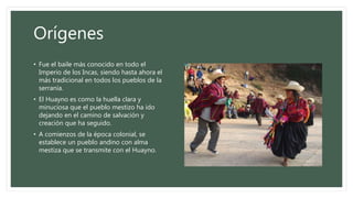 El huayno es el baile tradicional más conocido del Imperio Inca que aún se practica en los pueblos andinos. Es una expresión cultural mestiza que se desarrolló durante la época colonial. El huayno peruano es uno de los principales bailes de la región andina y consta de tres partes: introducción, cuerpo y remate. Existen variaciones regionales del huayno como el huayrlash, el ashu tatay y la chonguinada.