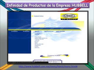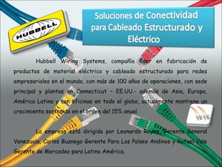 El documento describe los productos y servicios de cableado estructurado ofrecidos por Hubbell Wiring Systems, incluyendo cables UTP, FTP y accesorios como racks, bandejas y conectores RJ45. Explica las diferencias entre los cables UTP, FTP y sus categorías, así como sus usos comunes en redes de datos y voz.