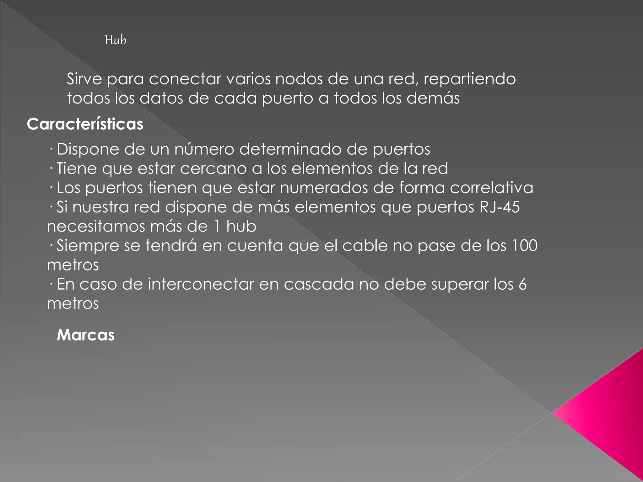 El documento describe las características y funciones de los hubs y switches de red. Los hubs distribuyen todos los datos de cada puerto a todos los demás puertos, mientras que los switches solo envían datos a puertos específicos. Algunas características clave de los hubs incluyen un número limitado de puertos y una distancia máxima de cable de 100 metros, mientras que los switches pueden funcionar con velocidades variables y mejoran la seguridad y integridad de la red.
