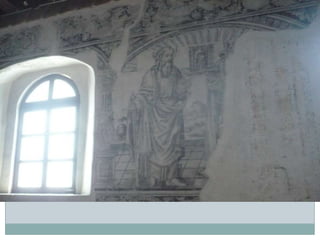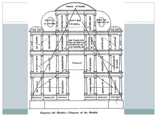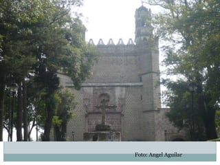 El documento describe la iglesia y convento de Huejotzingo. La iglesia tiene un atrio con capillas en las esquinas y una cruz central. Las capillas tienen ángeles que representan símbolos de la pasión de Cristo. El exterior de la iglesia es de estilo plateresco y mudéjar. El convento tiene un claustro bajo y alto con arcos de medio punto y columnas. También describe varias pinturas e imágenes religiosas dentro de la iglesia y el convento.