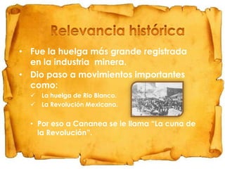 La Huelga de Cananea de 1906 en México fue la huelga más grande registrada en la industria minera en ese momento. Llevó al surgimiento de importantes movimientos obreros como la Huelga de Río Blanco y preparó el terreno para la Revolución Mexicana. Los obreros de Cananea presentaron un pliego petitorio con demandas de mejores salarios y condiciones laborales, pero fueron reprimidos violentamente por el gobierno de Porfirio Díaz que favorecía a los empresarios. Este evento marcó