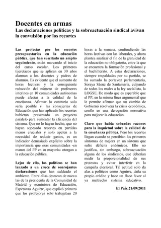 El documento discute los recortes presupuestarios en la educación pública española y las protestas de los sindicatos docentes. Esperanza Aguirre, presidenta de la Comunidad de Madrid, ha sugerido que se debe reflexionar sobre el costo de la educación después de los 16 años y que podría dejar de ser gratuita. Sus comentarios han aumentado las tensiones sobre las intenciones del Partido Popular de introducir pagos en la educación y la sanidad públicas.