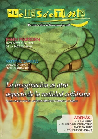 La revista presenta una entrevista con el autor John Marsden, reseñas de varios libros populares y una historia sobre la imaginación. También incluye noticias sobre próximos lanzamientos de libros y adaptaciones a películas, así como concursos y relatos cortos de ficción.