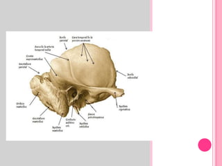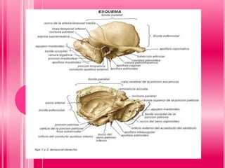 El hueso temporal es un hueso par y simétrico ubicado en la parte central de la cara lateral del cráneo. Se compone de tres huesos: el escamoso, el petromastoideo y el hueso timpánico. Se divide en tres porciones para su estudio: la porción escamosa, la porción mastoidea y la porción petrosa. Cada porción tiene características anatómicas específicas y se articula con otros huesos del cráneo.