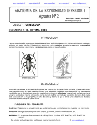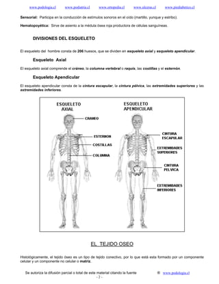 Este documento presenta información sobre el sistema óseo y el tejido óseo. Explica que el esqueleto está formado por huesos que se unen mediante ligamentos. Describe las funciones del esqueleto, las divisiones del esqueleto axial y apendicular, y los tipos de huesos. También describe la estructura y función del tejido óseo, incluidos los componentes celular y no celular, y la formación, irrigación e inervación de los huesos.