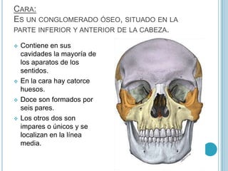 Los 14 huesos de la cara sirven para proteger los órganos de los sentidos y permitir la masticación. Incluyen el maxilar inferior, vómer, nasales, lacrimales, pómulos, cornetes, maxilares superiores y palatinos. Estos huesos forman las órbitas oculares, fosas nasales y otras estructuras de la cara.