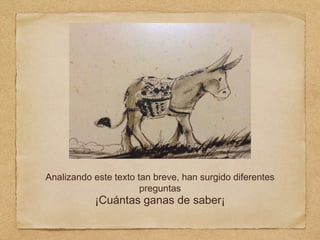 El documento presenta un análisis del poema "Platero" de Juan Ramón Jiménez. Se describe a Platero, el burro del poema, como suave y blando, sin huesos. Esto genera preguntas sobre si realmente no tiene huesos. Finalmente, se explica que la descripción de Platero como sin huesos es una hipérbole poética, y que todos necesitamos huesos para caminar.