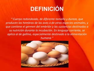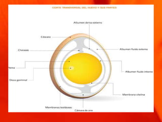 Este documento define el huevo y describe su estructura, composición y funciones. Explica que un huevo consiste en el cascarón, dos membranas, la clara (albúmina) y la yema. Describe los principales componentes de la clara (agua y proteínas como ovalbúmina) y de la yema (agua, proteínas como vitelina, y grasas). También compara la composición nutricional de la clara y la yema.
