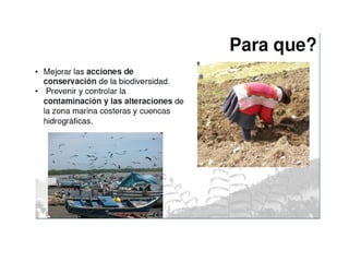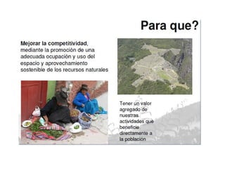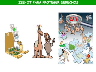 El documento discute la importancia del ordenamiento territorial en Perú para proteger los derechos ciudadanos. Explica conceptos claves como territorio, población y ordenamiento territorial. También describe los principios, enfoques y criterios para lograr un exitoso ordenamiento territorial, incluyendo la participación ciudadana, enfoque integral y sostenibilidad. Finalmente, explica cómo la zonificación ecológica y económica puede guiar el ordenamiento territorial.