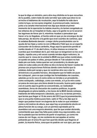 El documento es una carta imaginaria dirigida a Hugo Chávez donde el autor le cuenta sobre la situación en Venezuela durante su ausencia por razones de salud, incluyendo las protestas de la oposición que decían que Chávez había muerto y no regresaría, y cómo el pueblo permaneció unido apoyando a Chávez y la revolución. El autor también expresa su alegría por el regreso de Chávez.