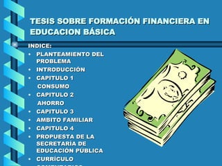 Este documento presenta un resumen de una tesis sobre la importancia de incluir la educación financiera en la educación básica. Explica que la mayoría de las personas no reciben educación financiera formal y carecen de habilidades para mejorar su bienestar económico. Propone incluir la educación financiera en las escuelas para enseñar conceptos como el ahorro, el consumo y la deuda a una edad temprana.