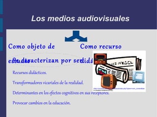 El documento describe el uso de los medios audiovisuales, en particular el video, en la educación especial. Señala que los videos pueden usarse como transmisores de información, para motivar a los estudiantes, para que los estudiantes generen conocimiento, y para la evaluación y formación de maestros. Luego proporciona ejemplos de cómo usar videos para cada uno de estos propósitos didácticos.