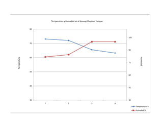 El documento presenta datos sobre la temperatura y humedad en cuatro estaciones en el bosque lluvioso Yunque. Muestra que la temperatura varía entre 63.2°F y 73.1°F entre las estaciones, y que la humedad alcanza 100% en dos de las estaciones.