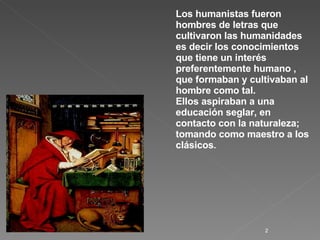 Los humanistas del Renacimiento cultivaron las humanidades y conocimientos humanos para formar al hombre de manera integral. Uno de ellos fue Baldassare Castiglione, quien describió el ideal educativo del Renacimiento en su obra "El cortesano", donde propuso que la educación del cortesano debe incluir ejercicios físicos y habilidades como la escritura, el habla y las artes. Castiglione también fundó la escuela "Casa Gioiosa" donde introdujo un nuevo modelo educativo basado en la alegría, la libertad y el contacto